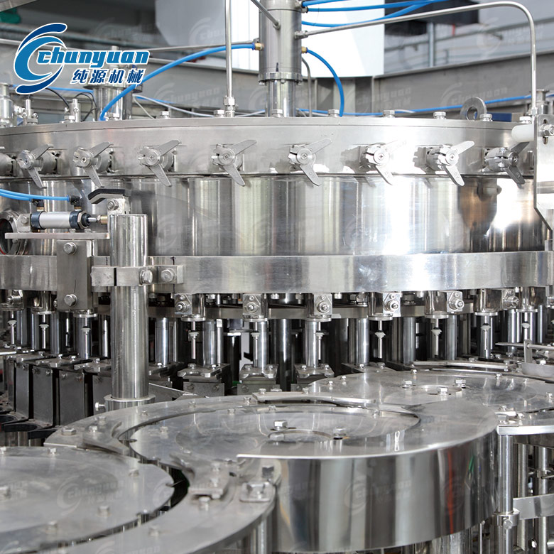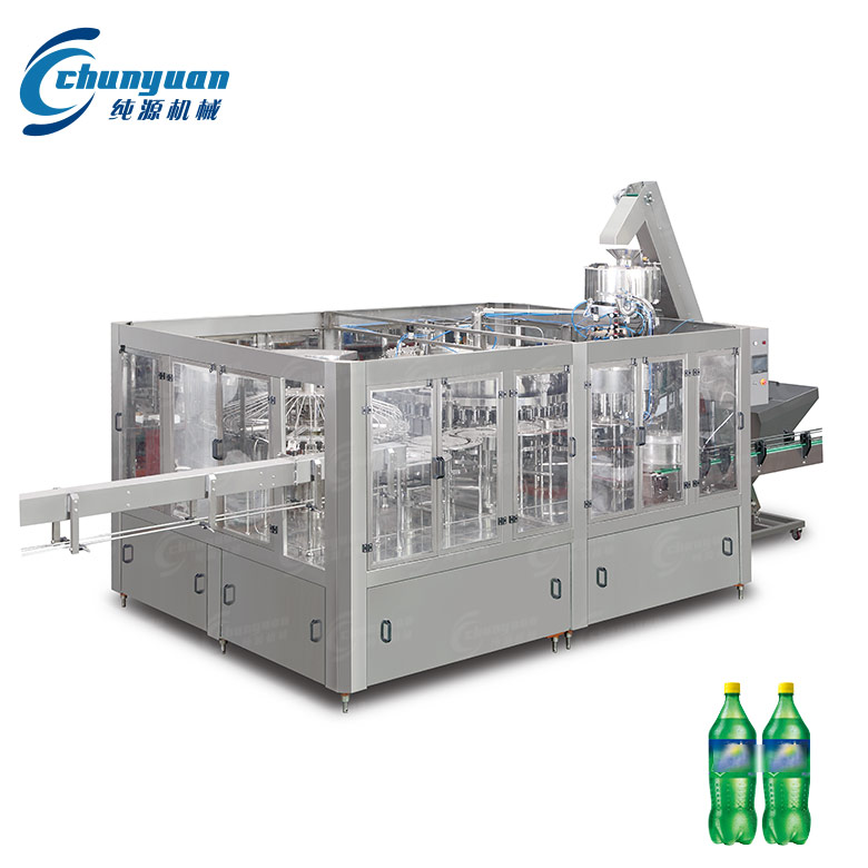 純源機(jī)械廠家供應(yīng)的雪碧含汽飲料機(jī)械集沖洗、灌裝、旋蓋于一體,適用于灌裝雪碧、可樂、碳酸飲料、含汽蘇打水等含汽飲料的聚酯瓶灌裝,全過程實(shí)現(xiàn)自動化。