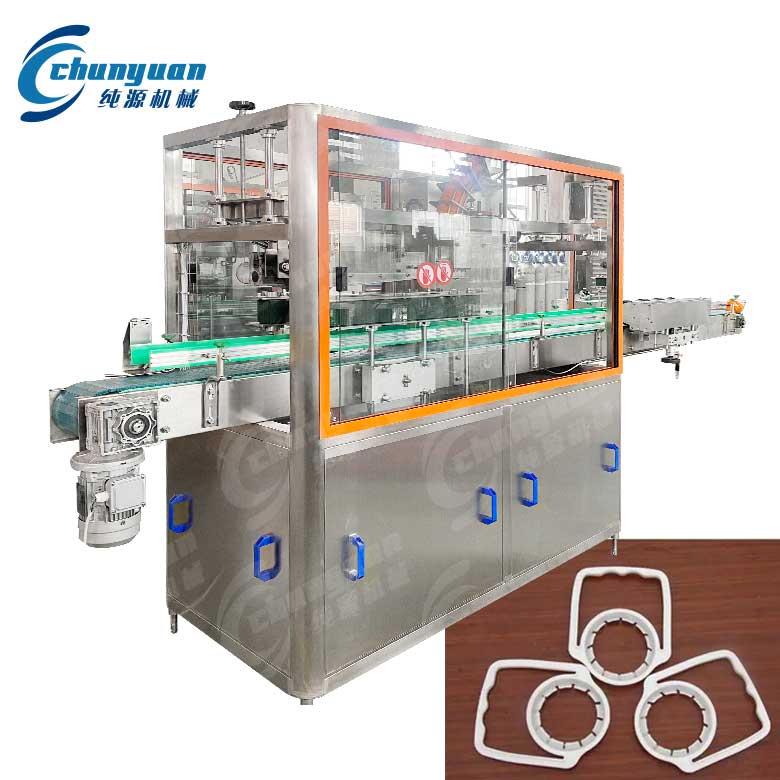 工藝流程:提手環(huán)自動(dòng)上料―手提環(huán)儲(chǔ)存槽-手提環(huán)環(huán)分離―手提環(huán)滑入狹槽――手提環(huán)套在瓶口上―手提環(huán)壓入完成并傳送到下一生產(chǎn)環(huán)節(jié)。